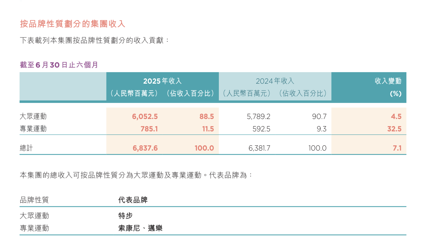 2025年上半年,特步主品牌收入同比增长4.5%至60.53亿元,占集团总营收的近九成。与此同时,专业运动分部索康尼与迈乐的收入同比大涨32.5%至7.85亿元,占比首次突破一成。